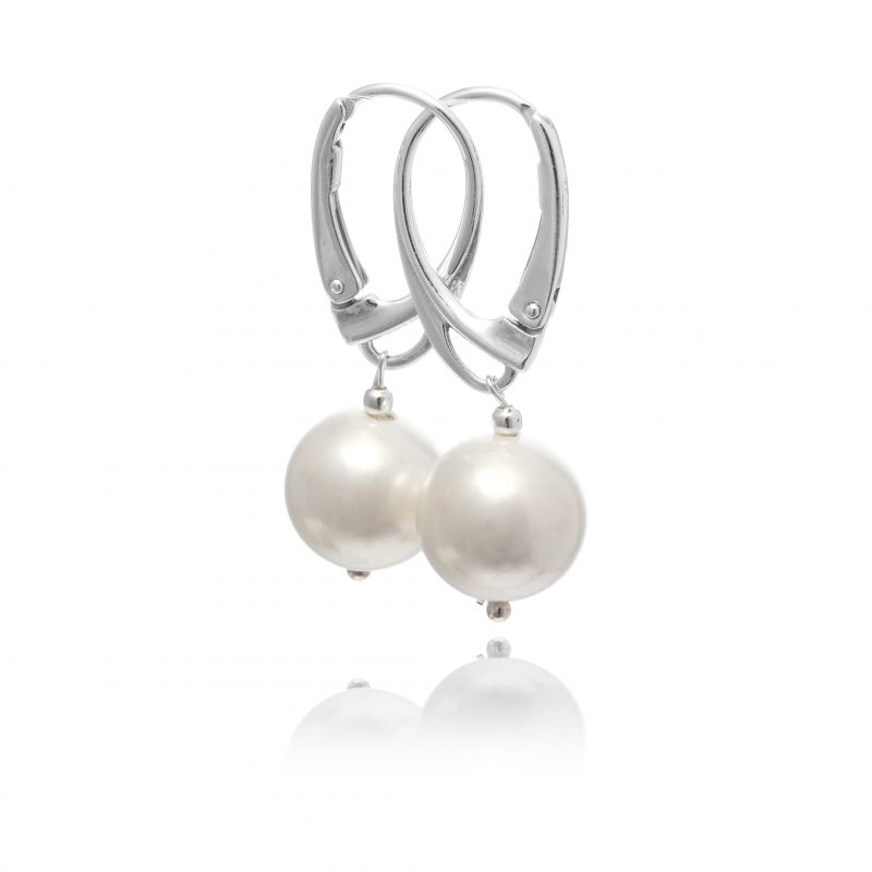 Earrings, shell pearls, white, round 8 mm, silver